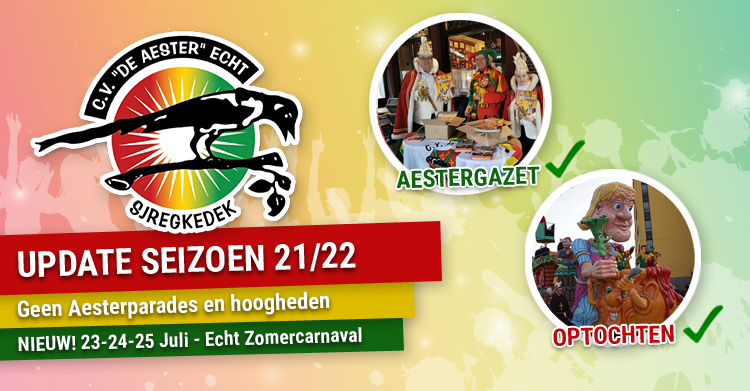 Gedurende de komende carnavalsperiode zullen wij, net als vorig jaar, de kansen pakken om op een verantwoorde manier, carnavalsactiviteiten te organiseren. In dat kader zullen wij, de carnaval uitdragen middels de traditionele Aestergezét, vergelijkbaar met de edities van vóór Corona. Daarnaast blijven wij hopen dat diverse andere activiteiten nog wel door kunnen gaan. Te denken valt dan aan de grote optocht op carnavalszondag en de kinderoptocht op carnavalsdinsdag.