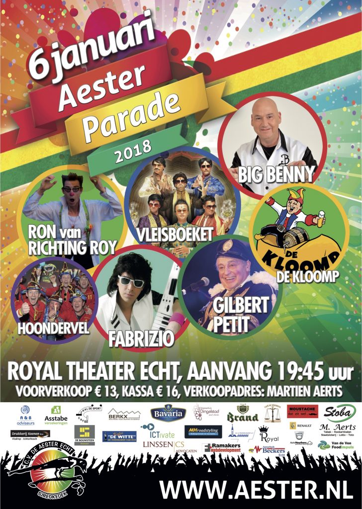 Carnavalsvereniging De Aester uit Echt is gestart met de voorverkoop van de jaarlijkse Aesterparade. Deze manifestatie vindt plaats op zaterdag 6 januari in Royal Theater, Peijerstraat 47 in Echt. Daar maakt prins Gijs I met zijn gevolg om 19.45 uur zijn opwachting, om tot zijn aftreden de scepter te zwaaien. Dat zal overigens van korte duur zijn, want meteen aan het begin van de avond vindt het hoogtepunt plaats. C.V. De Aester maakt dan op een ludieke manier bekend, wie de opvolger zal zijn van, op dat moment, Auwt prins Gijs I.