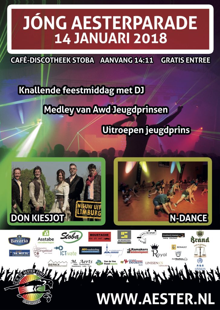 Zondag 14 januari is het tijd voor de jeugdige editie van de Aesterparade. Gedurende de middag zullen we te weten komen wie zich de 23ste jeugdprins van ’t Aesterriek mag noemen. Verder op het programma staat onder andere de traditionele medley van de Awd Jeugdprinsen, dans van N-Dance en een optreden van Don Kiesjot.