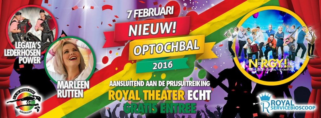Na de grote optocht in Echt organiseert Royal Echt in samenwerking in samenwerking met C.V. De Aester Echt een volledig nieuw evenement: het “Optochbal”! Aansluitend aan de prijsuitreiking (die omstreeks 18:33 begint) van de grote optocht zal er een gigantisch feest losbarsten met Feestband N’RGY, Marleen Rutten en Legata’s Lederhosen Power.